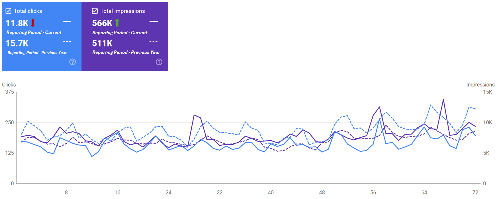 Across the majority of our clients, we’ve seen, first-hand, how AI Overviews have impacted clicks. As you can see from the screenshot below, our impresssions have increased year-on-year (YoY) while clicks have decreased.